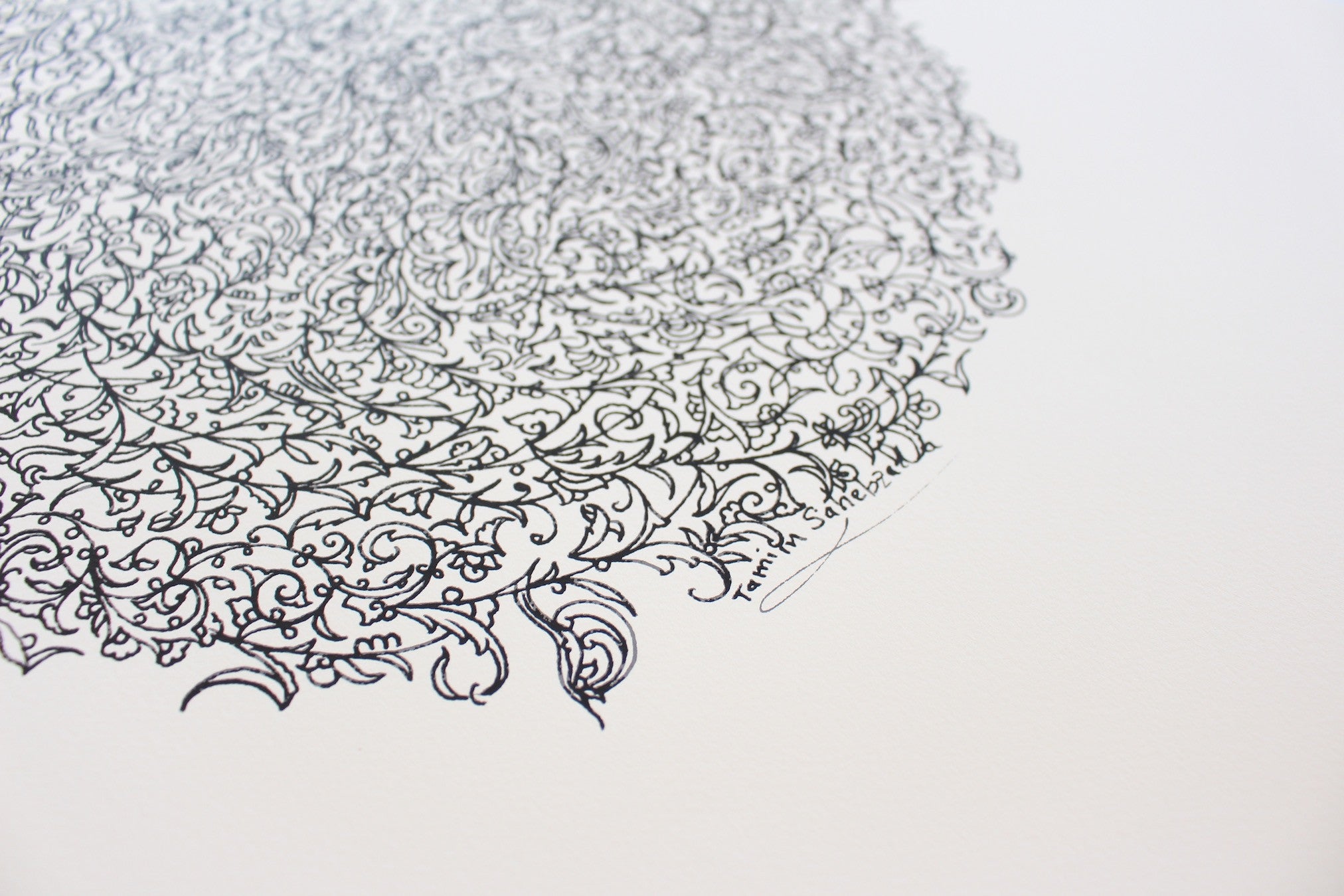 The delicate curling floral motifs in this exquisite work derive from the decorative illumination found in traditional Persian miniature painting. Typically, illumination forms the decorative sections around important letters or blocks of text, or fills the margins as a colorful frame for the central image. Here however, the artist has made illumination the subject of the work, filling a central oval form with dense grey foliage. The restless patterns give a sense of continuous motion, never letting the eye rest, but tracing, as it were, life’s constant turmoil.