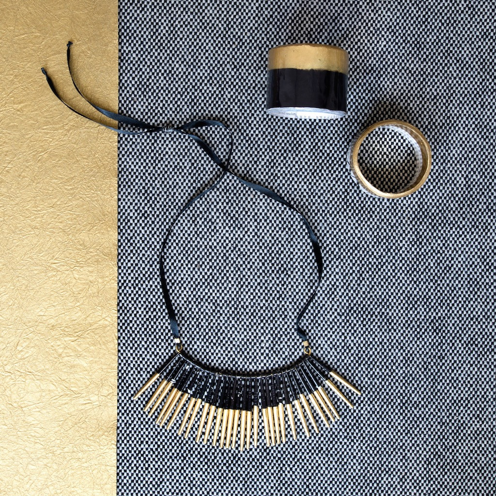 Recycled magazines are collected and transformed into an original and stunning black and gold beaded necklaces. Each one is handmade by local women in Swaziland who are empowered through skill sharing and income earning.