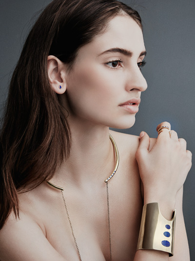 Artisan: Connecting Worlds A brass choker with lapis stones wraps around the neck and is finished with a delicate chain...