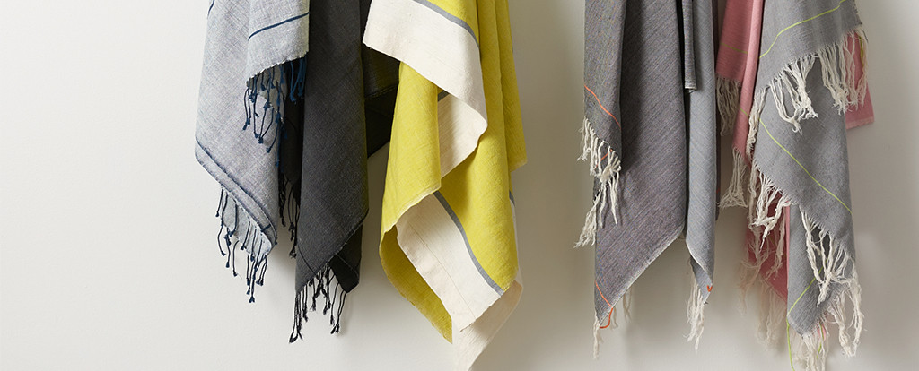 Artisan: Kara Weaves These handwoven, cotton towels are embellished with a bold circle graphic and available in blue, grey and green....