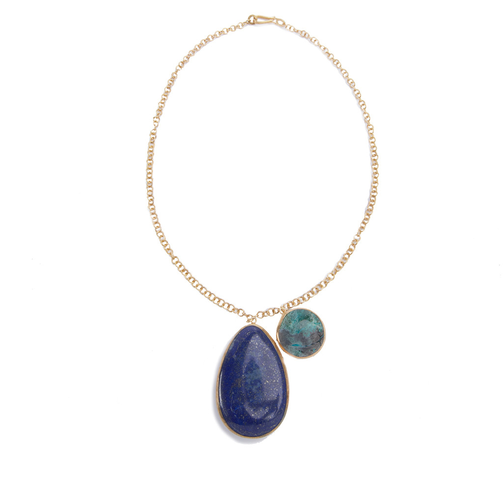 Handcrafted from 18-kt-gold plated silver, this striking necklace features pendants of chrysocolla and lapis lazuli. The stones are locally sourced in Afghanistan.